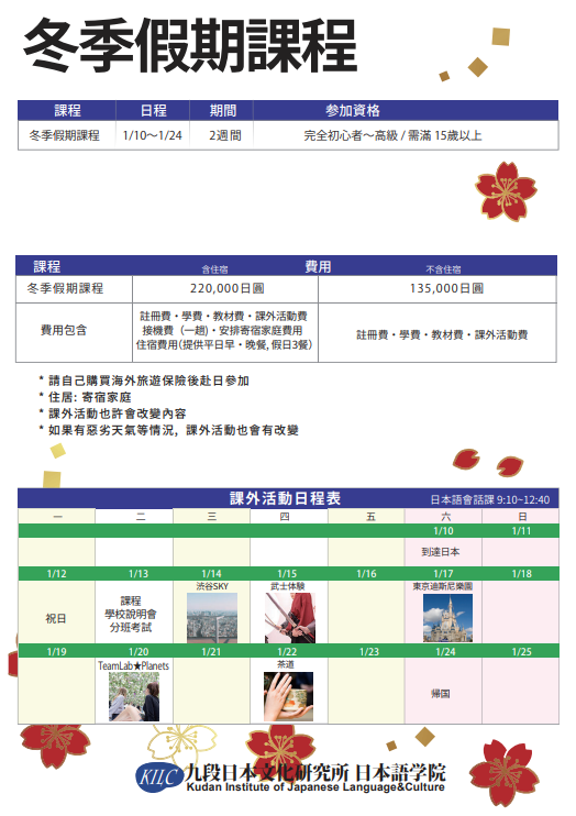 課程:1/10-1/24(2週) 費用為220,000日圓(含住宿、接機);135,000日圓(不含住宿、接機)