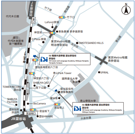 ISI職業外語學園澀谷原宿校位於流行文化和商業中心的澀谷原宿區。強化就職資源的獨特課程,對於想在日本就職或創業的人,從初級開始,依照不同的學習階段,提供商業日文課程並導入最新的LMS學生管理系統,幫助學生更有條理及計畫的環境下進行就職活動。